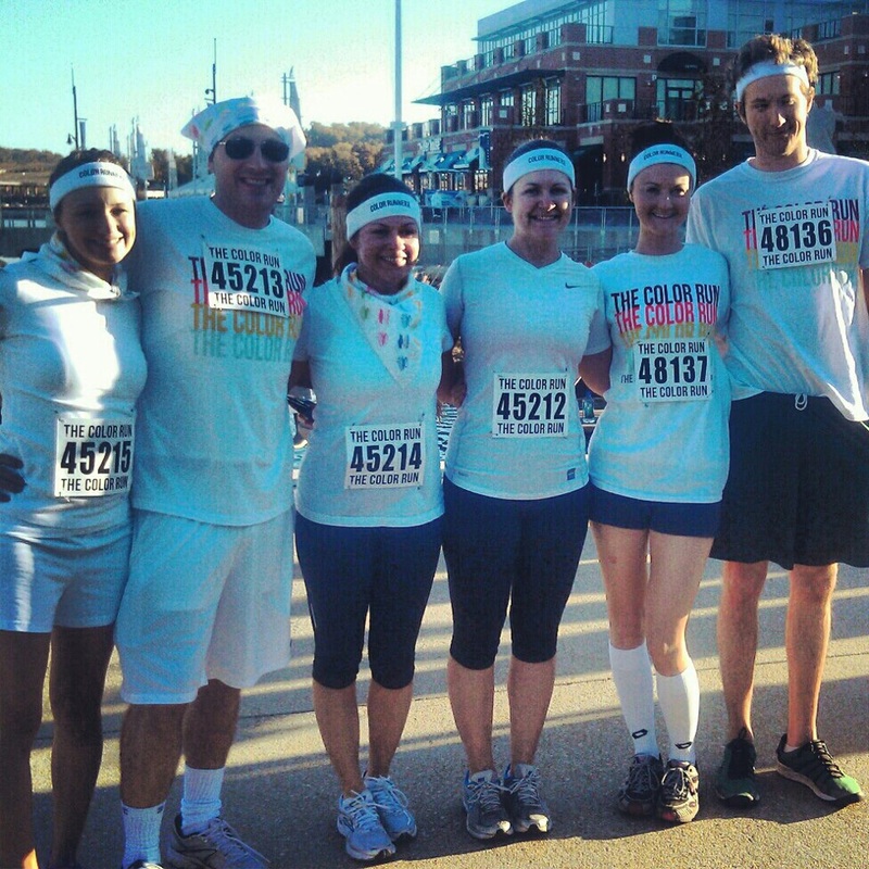 Washington, DC | October 21, 2012 | colorful 30ish minutes | What an experience. I had no idea what this was going to be like- only that it looked like fun. π Megan, Brian, Julie, Kirby and I headed out to National Harbor in our whites to get colorized. The send you through the course in waves because they let so many runners in. We got out pretty quick and headed around the course.Β