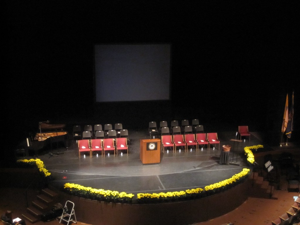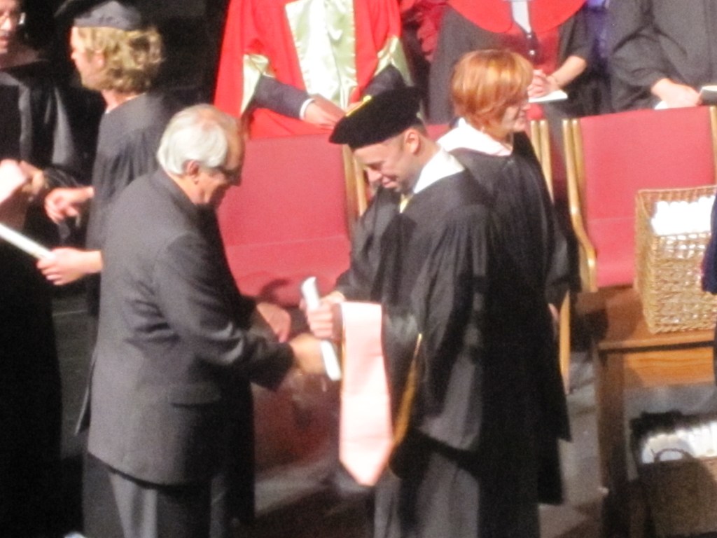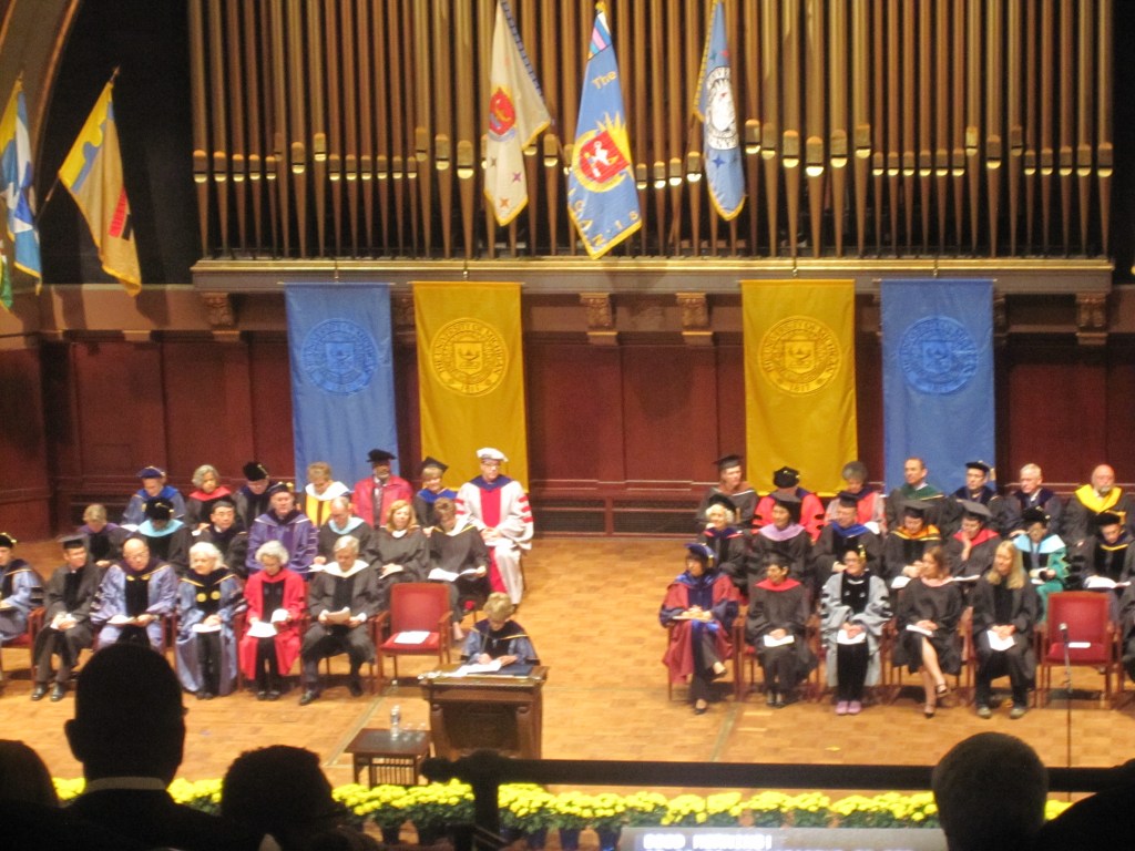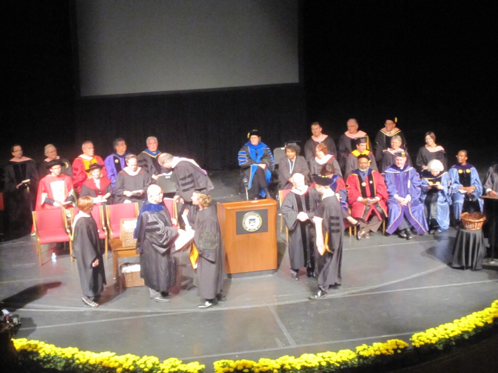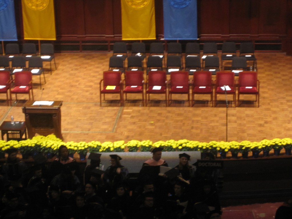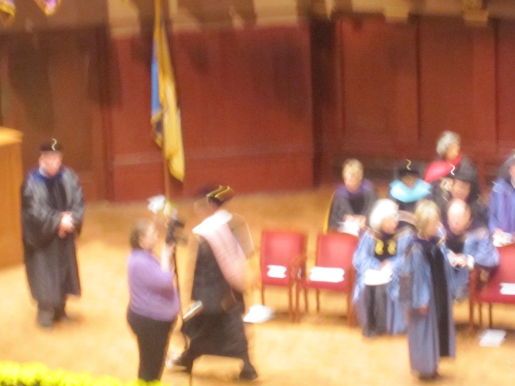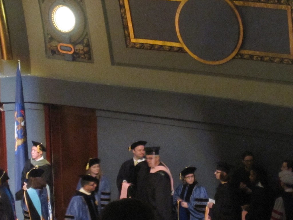 Friday we were all up bright and early for the first ceremony, doctoral hooding. It was a little chilly and drizzly outside and we had to wait in line to get into the ceremony space. We all crammed into the mezzanine level seats hoping to get a good view of the stage (which then proved to be a little difficult with all the folks trying to get photos in the aisles). However I did manage to get a few shots of Jon crossing the stage and we did end up taking lots of photos later on. After this ceremony we headed over to Red Hawk for lunch where I had a delicious pork sandwich on open face cornbread. Yum!