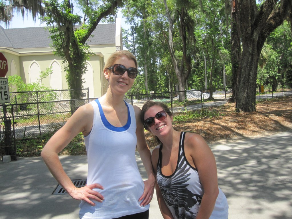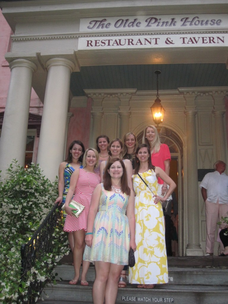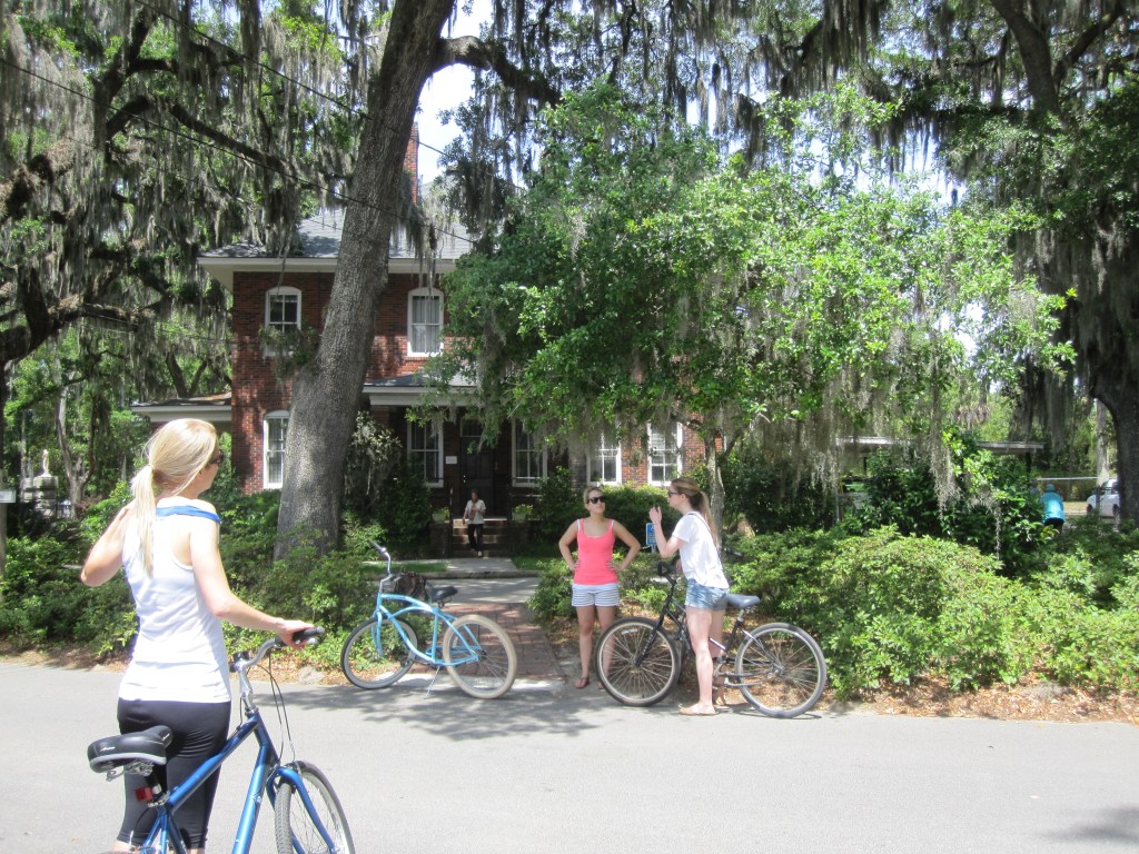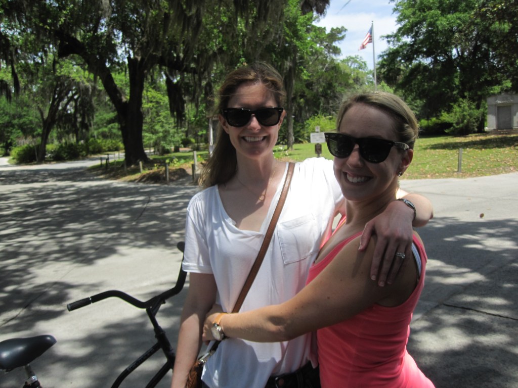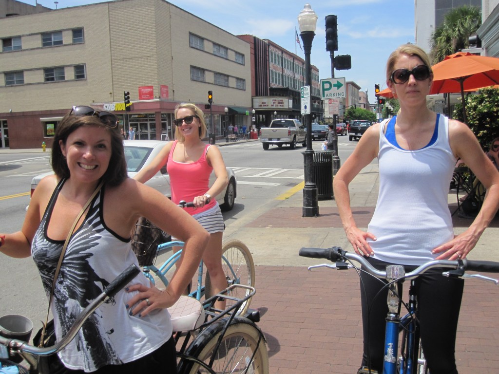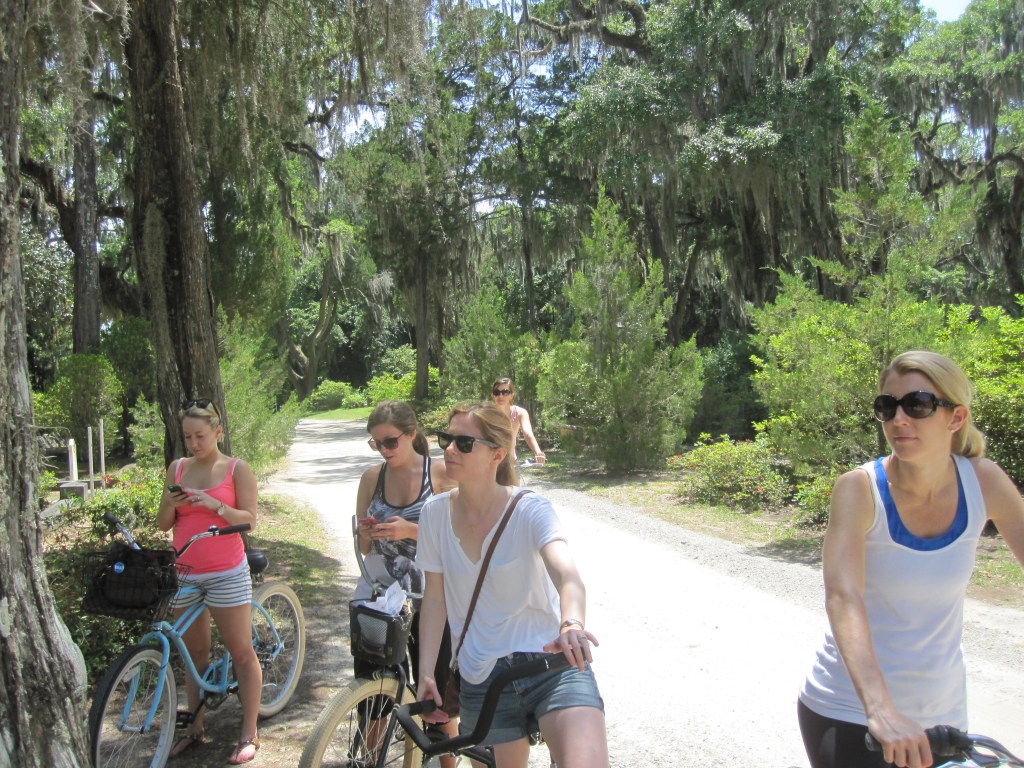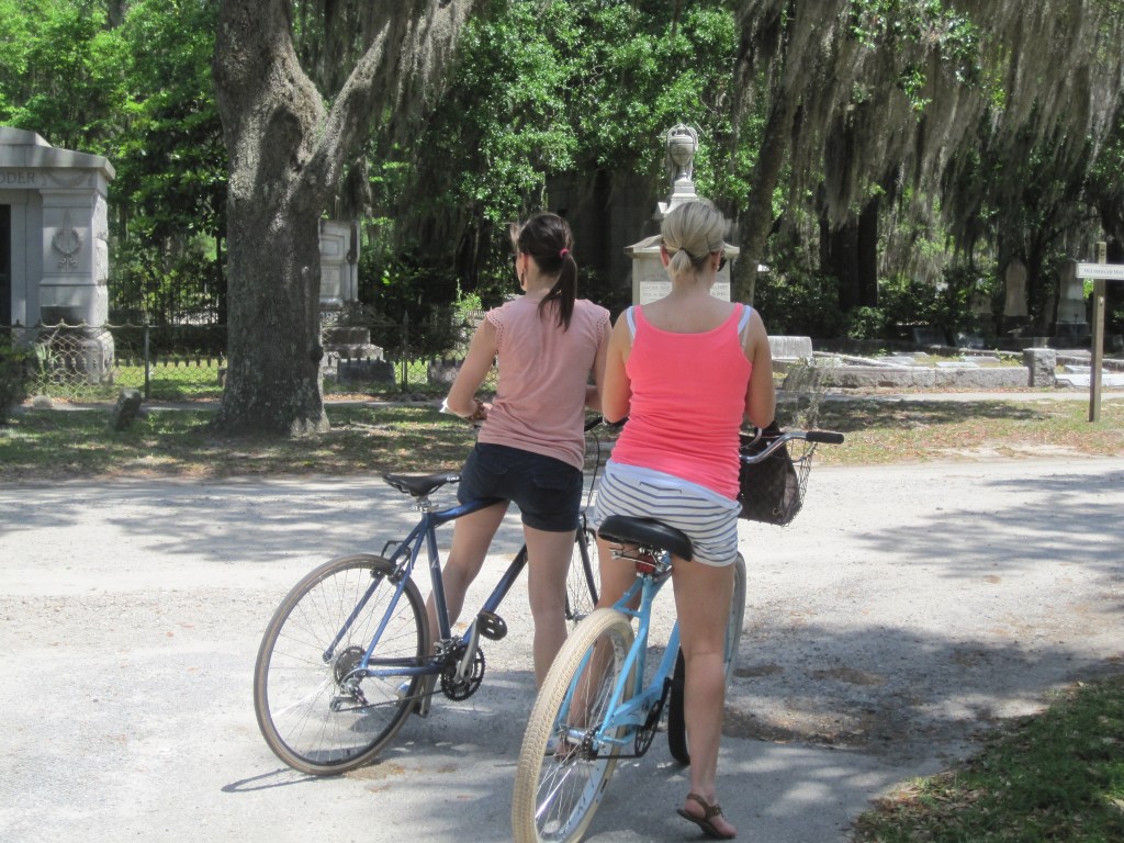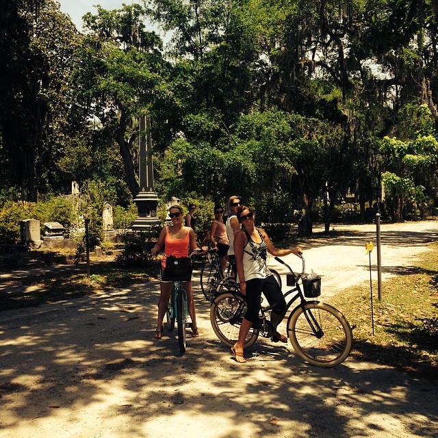 Day 1: A group of us DC ladies flew in super early and stored our luggage at the hotel. A really nice Holiday Inn Express literally in the middle of everything. Emily and Kristi arrived not much later than we did coming by car from Raleigh. We started out the weekend at Moon River Brewery – a beef brisket tacodilla and a beer (that I was then able to take to go!). After lunch we walked over to a bike rental place, grabbed bikes and headed on quite the journey to get to the Bonaventure Cemetery. We looked pretty hilarious- a group of 6 girls biking in a line through Savannah neighborhoods- but we made it in one piece and the cemetery was beautiful. It was very large but between the trees and other greenery we took lots of fun photos biking around. Kate and Caitlin both landed while were were out biking so we met up with them on our return to the hotel. A round of showers were needed for everyone before we got all beautified for dinner at the Olde Pink House. It was fantastic – biscuits and cornbread started out the meal, before I had almond crusted tilapia and bacon smashed potatoes. Yum!! After dinner (with a food baby in tow) we headed over to start our haunted pub crawl. We got special glow in the dark cups for the evening. We went to five total stops and listened to our guide tell great ghost stories about the places in Savannah. It finished up at Moon River where we’d been earlier in the day and we got to up into the haunted section of the building. I have to admit it was a little creepy and definitely warm up there. Great Day One!!!