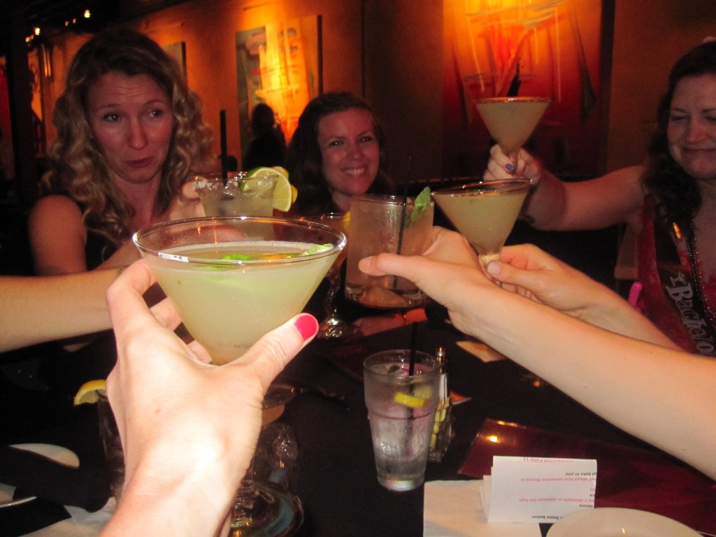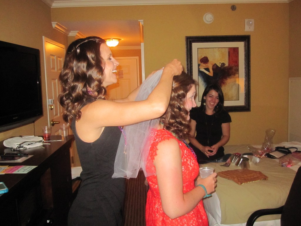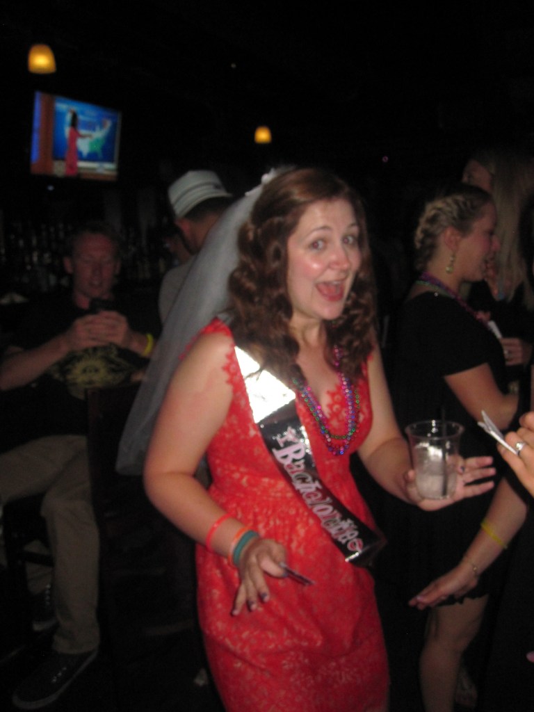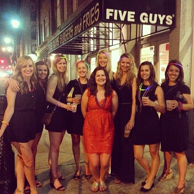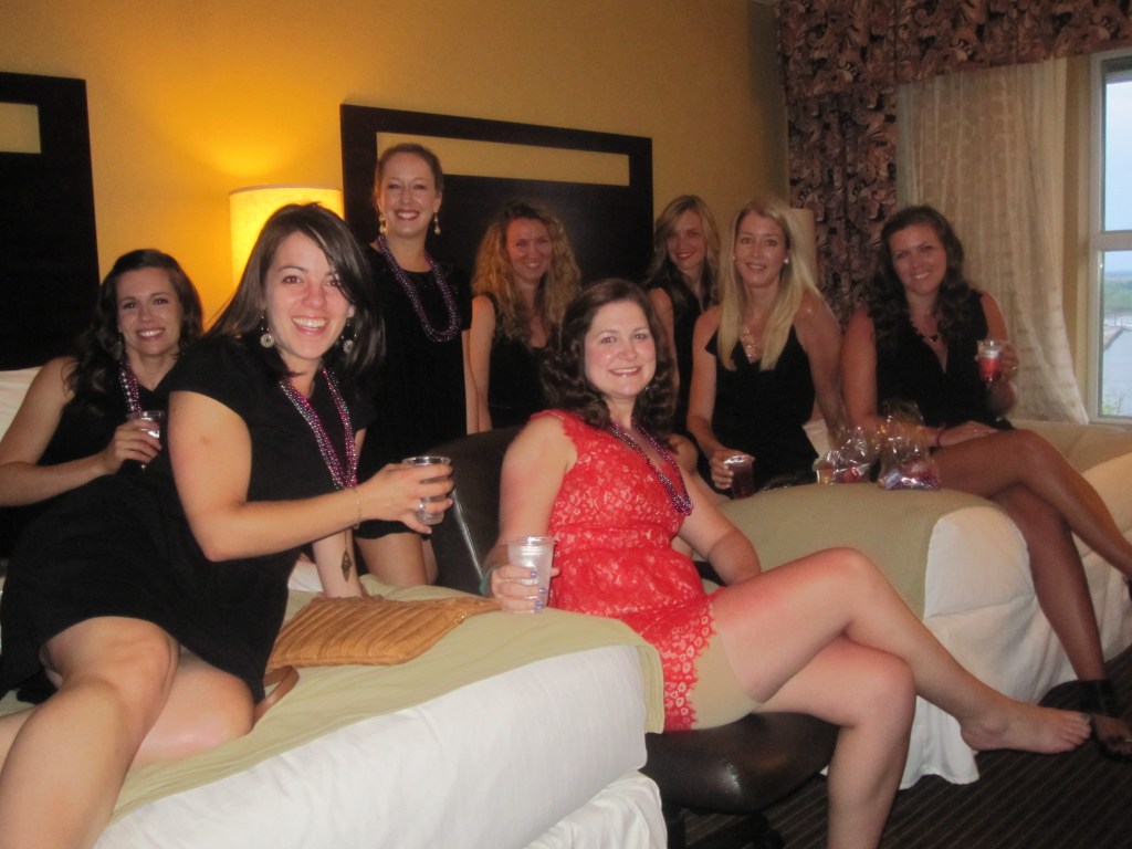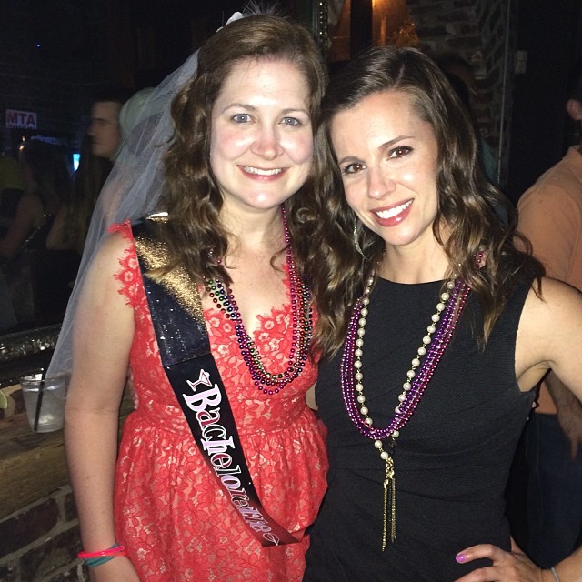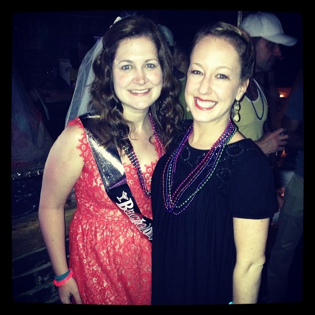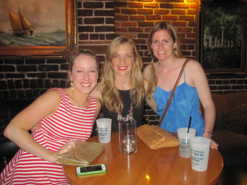Day 2: Because naturally I can’t sleep past 7am these days I was up early. Kate being on Tanzanian time from work was also up so we went down to have free breakfast in the hotel. We hung out for a bit as the others came down and joined us as they woke up. And then Colleen arrived! She had gotten stuck in Charlotte the night before due to weather and so had to take the first flight out on Saturday morning. We were glad she finally made it to join in on the days festivities. We headed over to the Riverwalk to do a little walking/shopping/meandering. There were some really cute shops especially the Savannah Bee Company which had amazing honey products that a lot of us went back to purchase on Sunday. After walking a bit we decided to find a rooftop to hang out on for awhile. Rocks on the Roof turned out to be just that. We had some mimosas and bellinis before moving into the inner area to eat some food. Black bean hummus for the win. also truffle fries. delicious. After lunch we headed back to the hotel to enjoy the rooftop pool for a bit. JJ, Kristi, Kate and I headed over to a nail salon to start the beautifying for the evening. We started getting ready, I put on my second fancy dress from rent the runway before the party began! Goodie bags for the girls, veil and sash for me and beads all around – after a little room party time we headed to our dinner reservation at Jazz’d. Really tasty tapas and I had a great citrus and basil martini. Then we started on our pub crawl for the evening – had a blast!!! Fantastic Day Two!