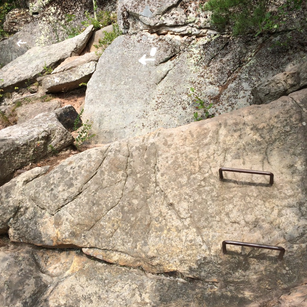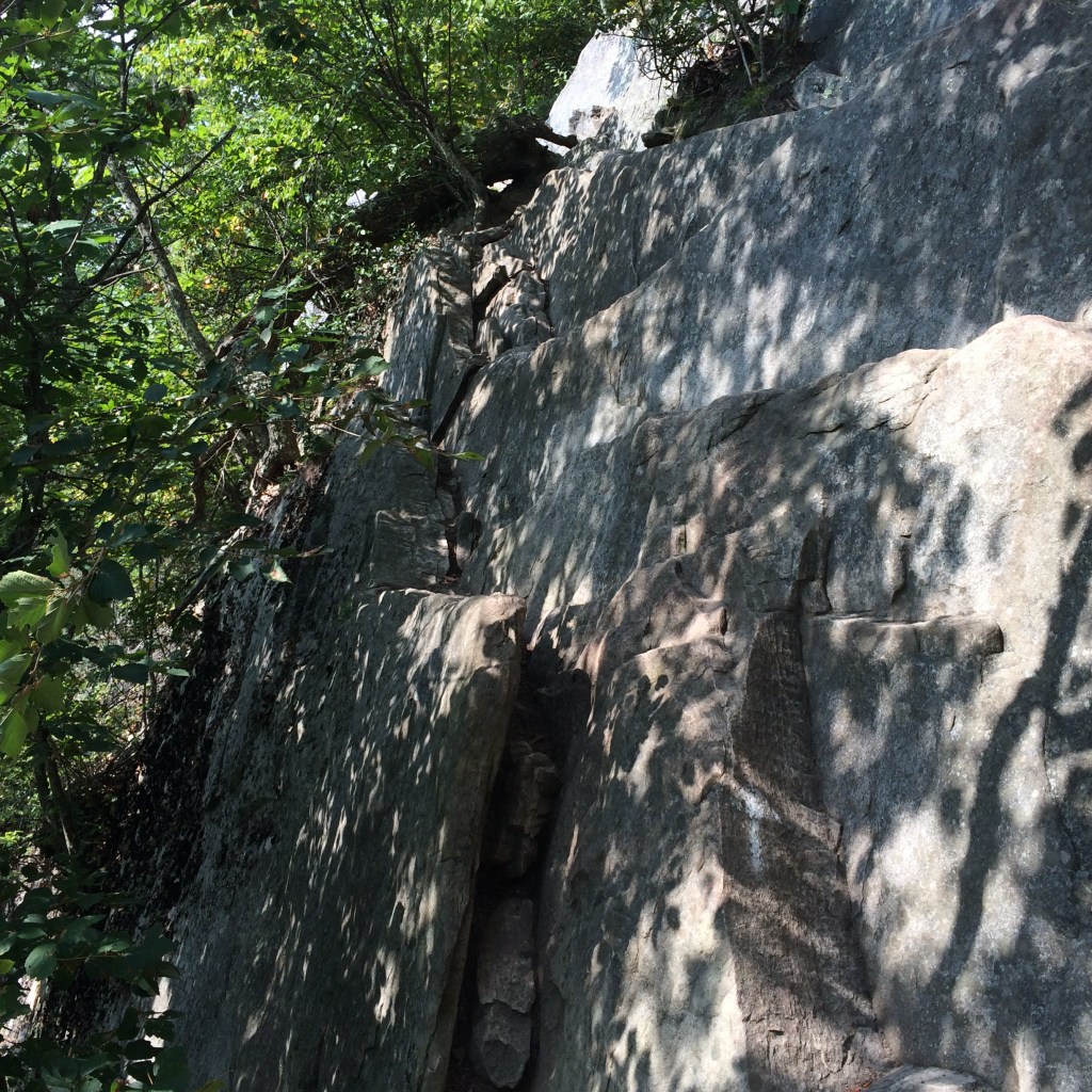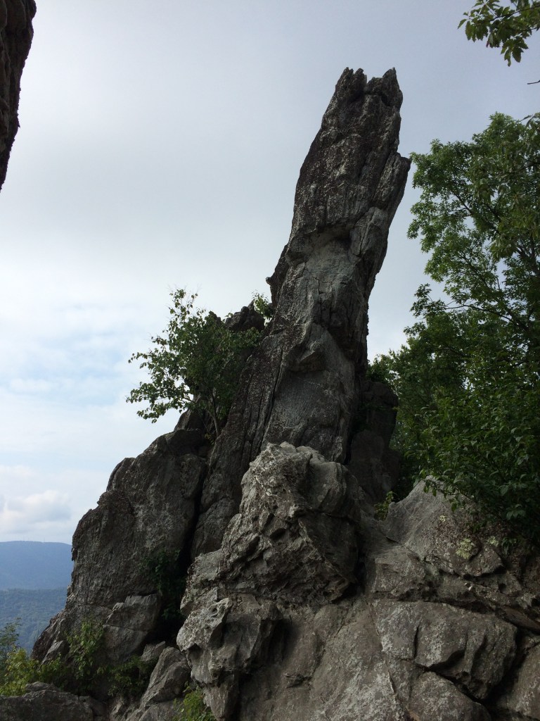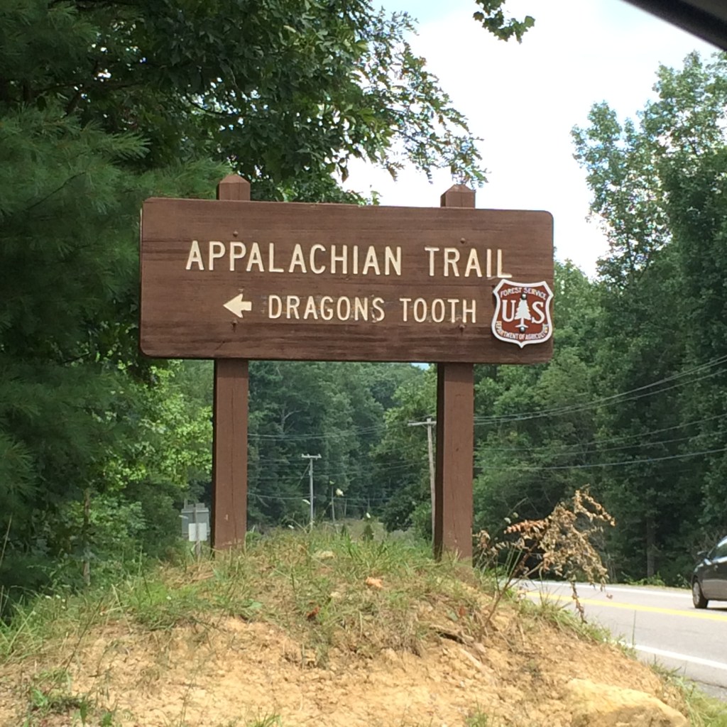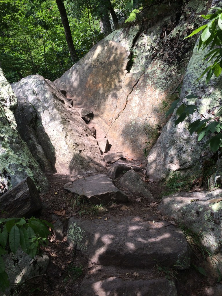 We drove about 35 minutes from our place to a trail access off VA 311 near Catawba. Thankfully they had restrooms (albeit not flushable ones- but I’ll take it). In order to access Dragon’s Tooth we had to climb a trail to the Appalachian Trail. Now it was pretty rocky but not too difficult to maneuver and after about 1.5 miles we made it to the AT connection. There were campsites as this spot so we took a quick breather, had some water and stretched before taking on the next section. Now the rumors were that this part of the AT– on the way to Dragon’s Tooth– was the most difficult stretch. I thought it was the most fun, if not a little terrifying. We started along the trail and all seemed fine and then suddenly we were climbing over rocks, using small ladders to get us upwards, basically bouldering up the mountain. All parts awesome!! I was a little worried about how we’d get back down but hey we were still headed up at that point!
