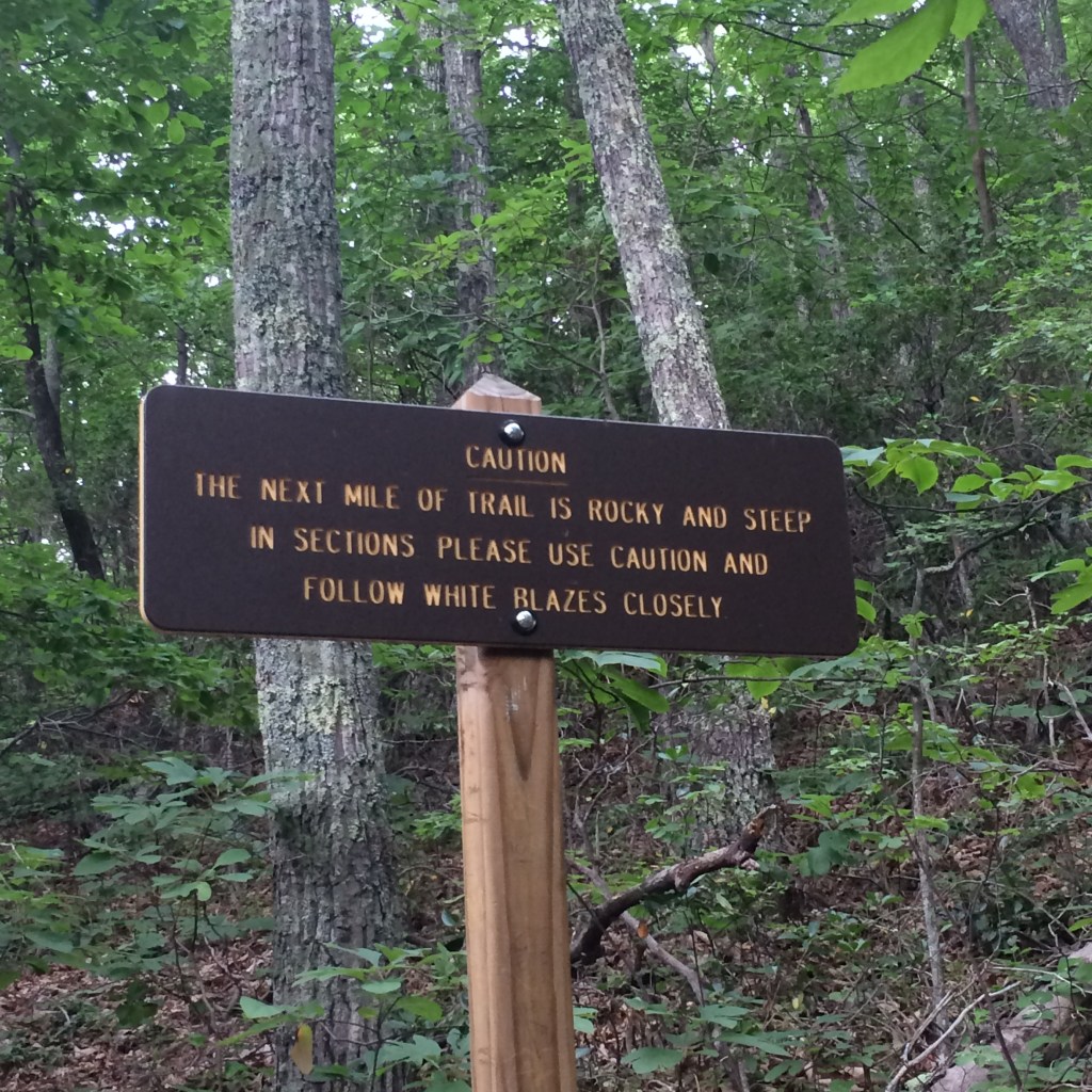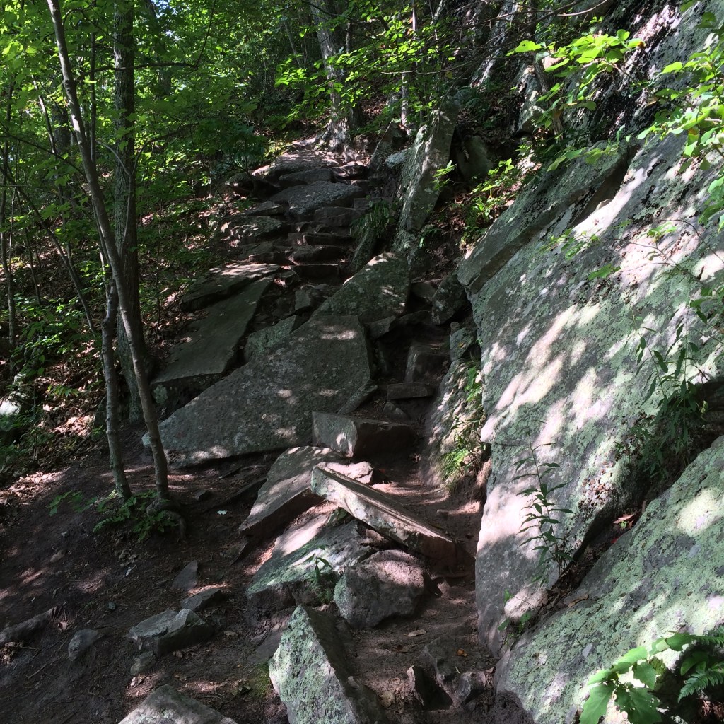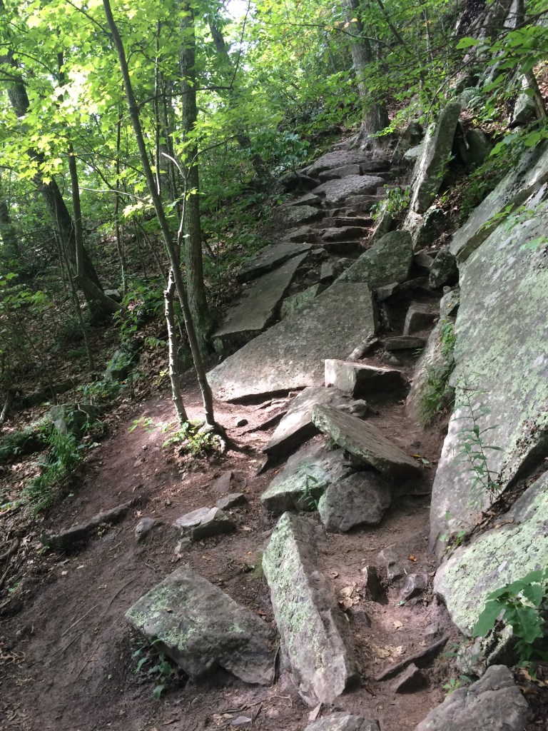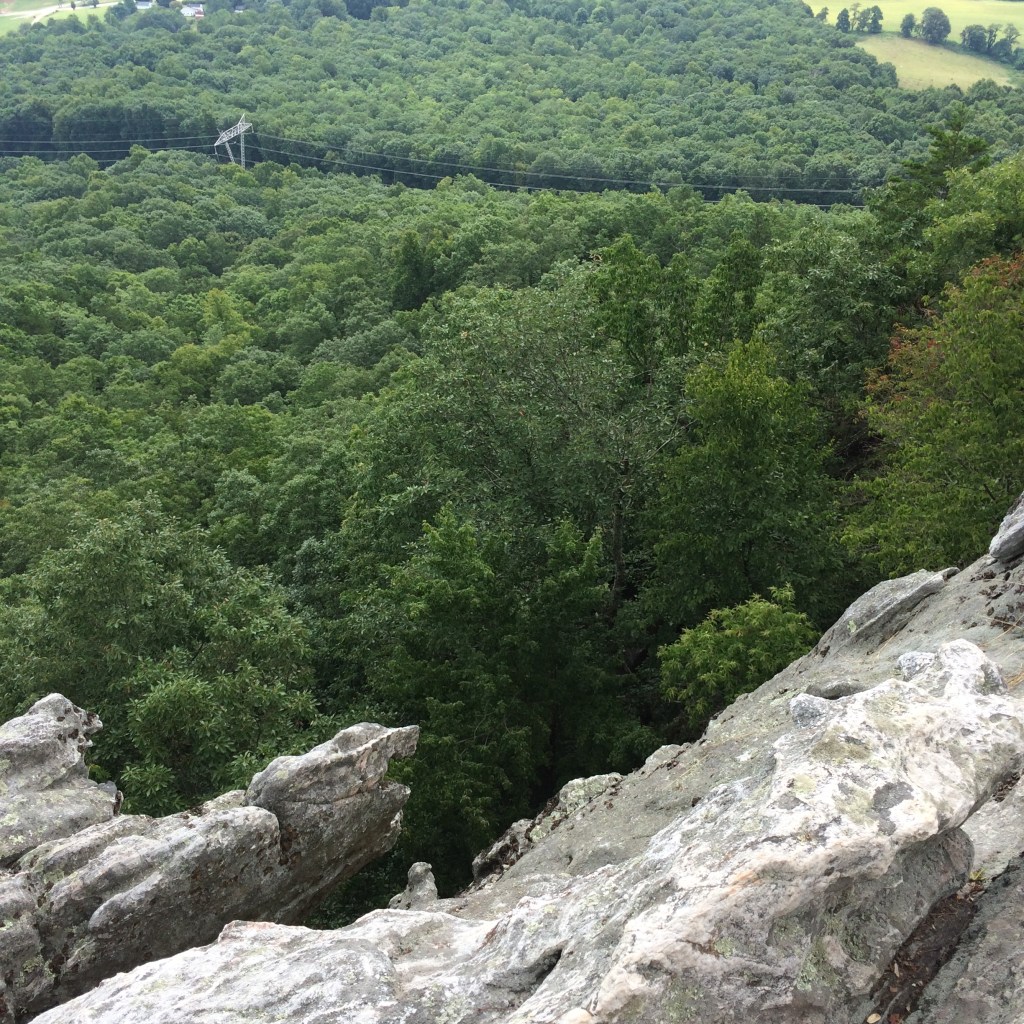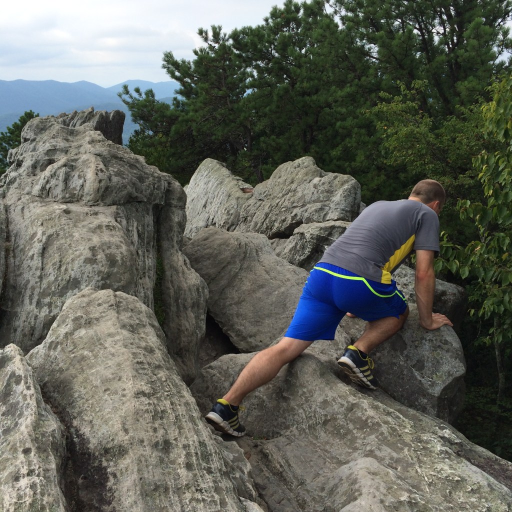 We drove about 35 minutes from our place to a trail access off VA 311 near Catawba. Thankfully they had restrooms (albeit not flushable ones- but I’ll take it). In order to access Dragon’s Tooth we had to climb a trail to the Appalachian Trail. Now it was pretty rocky but not too difficult to maneuver and after about 1.5 miles we made it to the AT connection. There were campsites as this spot so we took a quick breather, had some water and stretched before taking on the next section. Now the rumors were that this part of the AT– on the way to Dragon’s Tooth– was the most difficult stretch. I thought it was the most fun, if not a little terrifying. We started along the trail and all seemed fine and then suddenly we were climbing over rocks, using small ladders to get us upwards, basically bouldering up the mountain. All parts awesome!! I was a little worried about how we’d get back down but hey we were still headed up at that point!