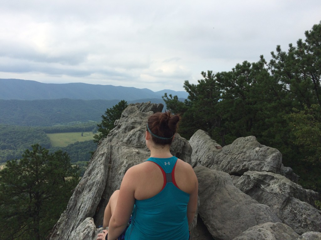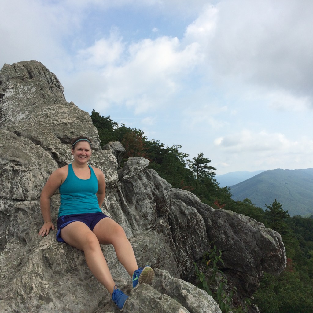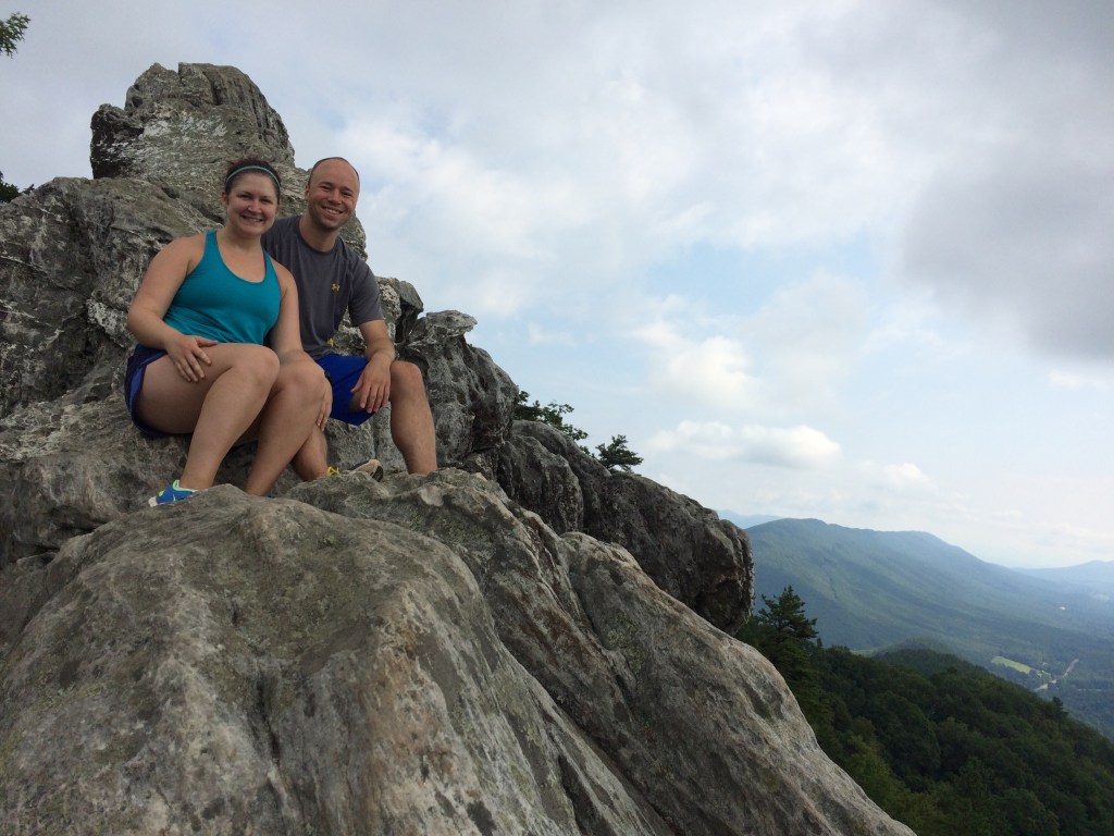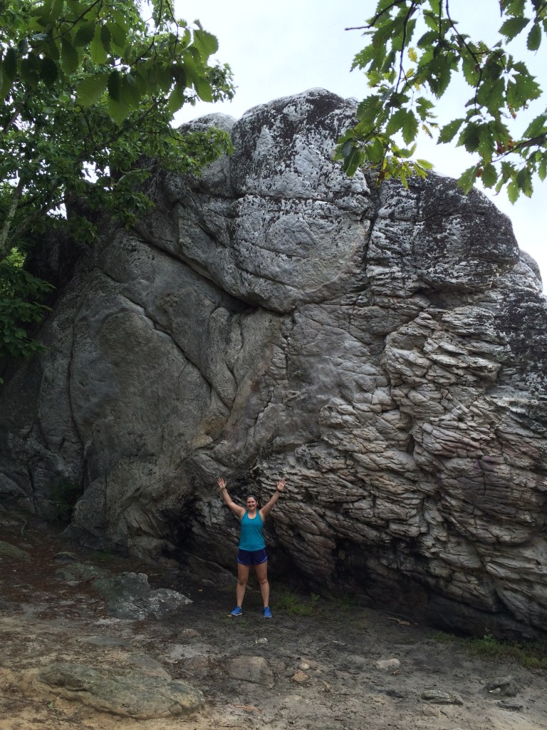 We finally reached the top and the ‘tooth’ was huge!! We ran into a few AT hikers who had climbed on top and of course I wanted in on that as well because I was sure the views were awesome. So first we ate our granola bars and drank lots of liquids before trying to scramble to the top. Jon went first- his long legs were able to stabilize him to get up and onto the rocks. My legs however were not going to cut it. But! I found a place to essentially crawl into the rocks and shimmy/prop my way up to get on top! Success! I felt pretty proud of myself at that moment. Then we looked to our rights and wow what a view! It was awesome to be up there. We sat down for a few minutes and took lots of pictures before it was time to shimmy back down and make the trek back to our car.