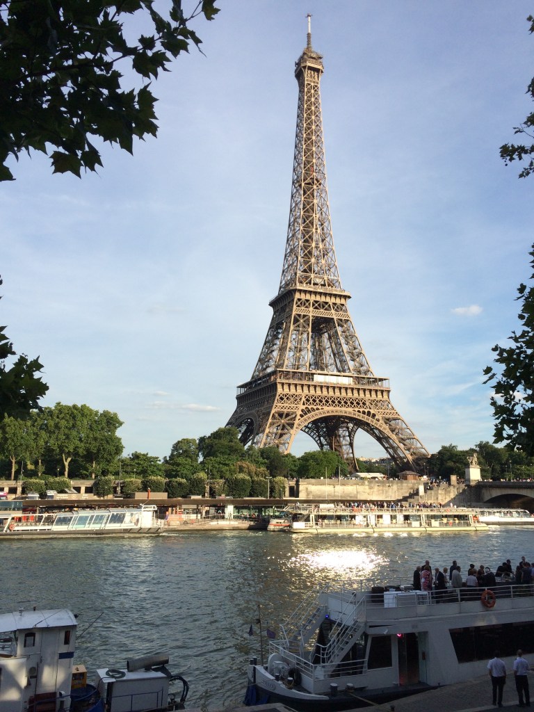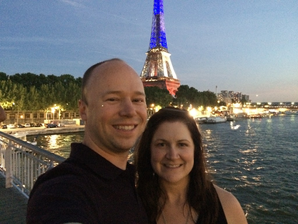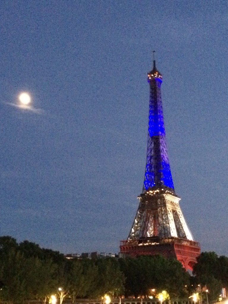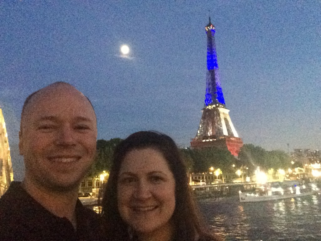 After wandering all day, we stopped back at our hotel (which was decorated for our honeymoon) to enjoy the chocolate and champagne. So nice! And then we headed back across the Seine to eat at Les Marches. In 2009 when Ethan, Elizabeth and I were traveling we stumbled upon this cute cafe and ate one of our best meals in Paris. I was eager to return and conveniently it is right across the river from the Eiffel Tower- so perfect views! We started with wine (of course) and then had a delicious dinner and dessert! Dining al fresco with near perfect weather. I couldn’t have asked for a better evening. We finished it off by walking across one of the bridges and enjoying the eiffel lit up like the French flag. The view was absolutely amazing.