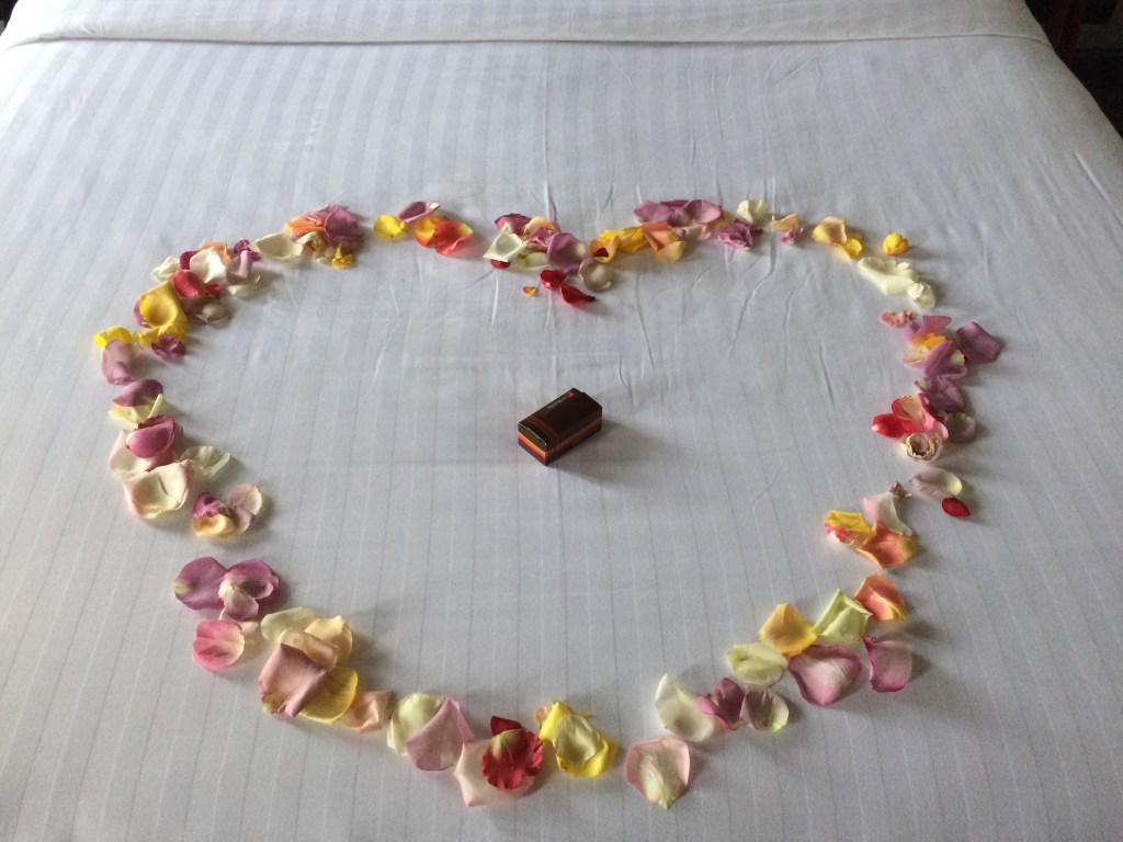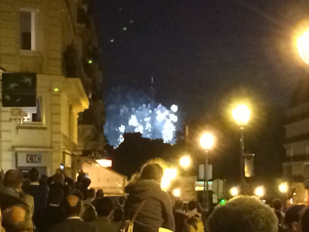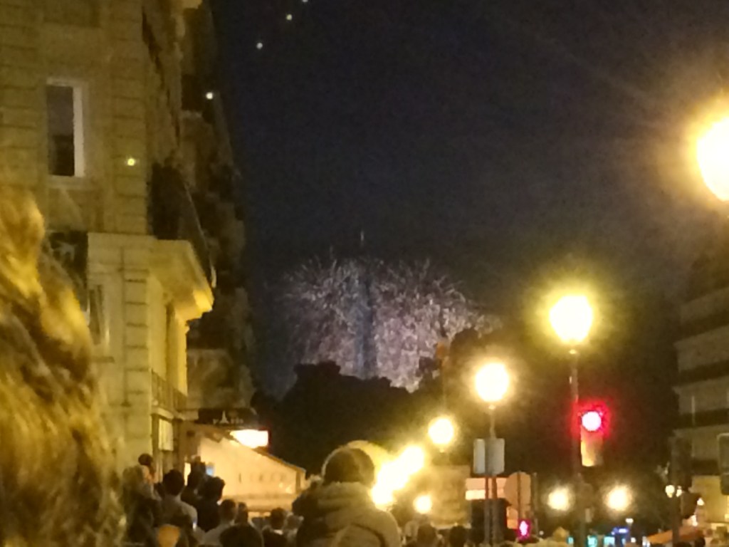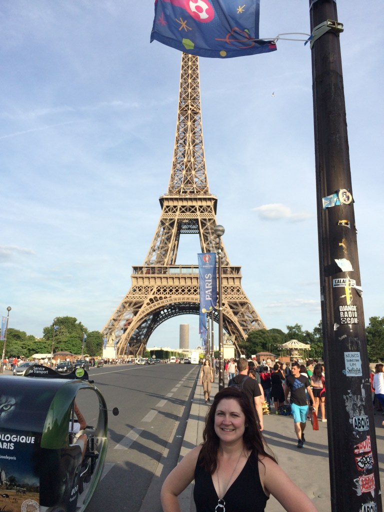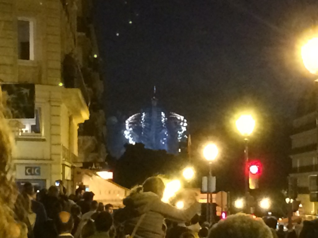 After wandering all day, we stopped back at our hotel (which was decorated for our honeymoon) to enjoy the chocolate and champagne. So nice! And then we headed back across the Seine to eat at Les Marches. In 2009 when Ethan, Elizabeth and I were traveling we stumbled upon this cute cafe and ate one of our best meals in Paris. I was eager to return and conveniently it is right across the river from the Eiffel Tower- so perfect views! We started with wine (of course) and then had a delicious dinner and dessert! Dining al fresco with near perfect weather. I couldn’t have asked for a better evening. We finished it off by walking across one of the bridges and enjoying the eiffel lit up like the French flag. The view was absolutely amazing.