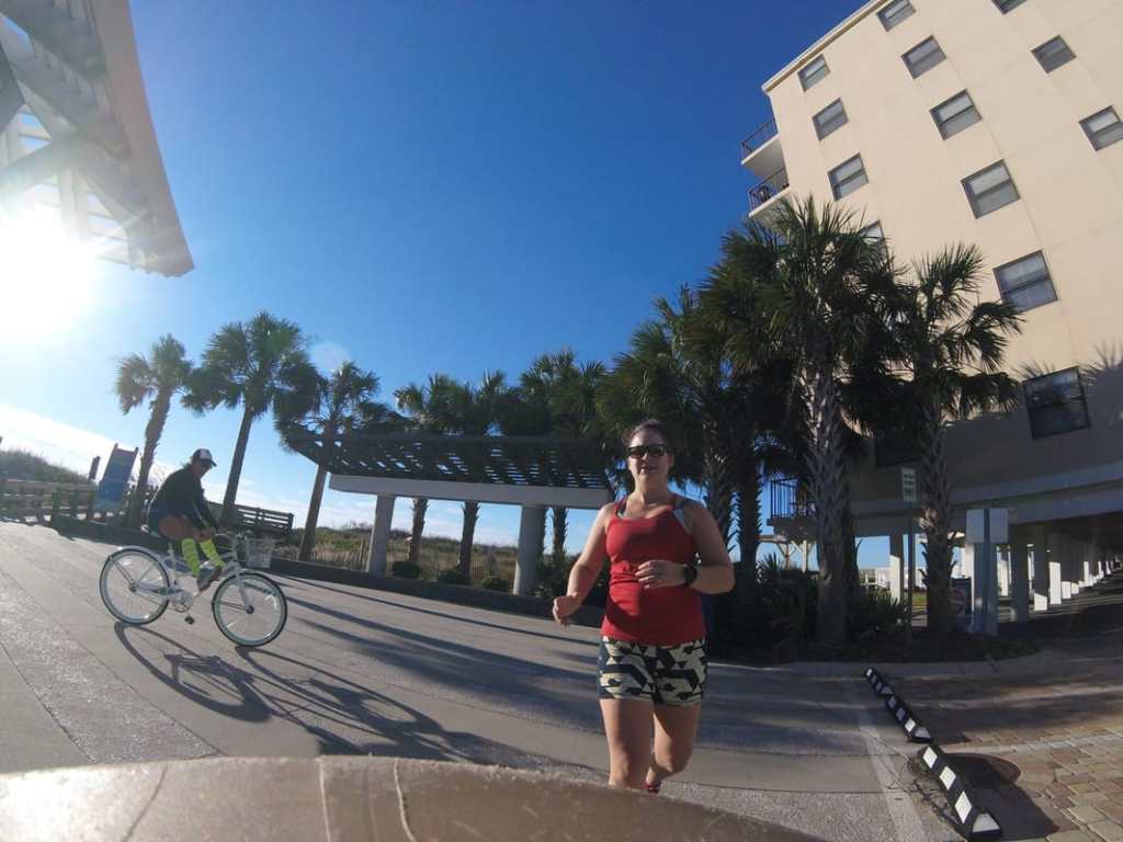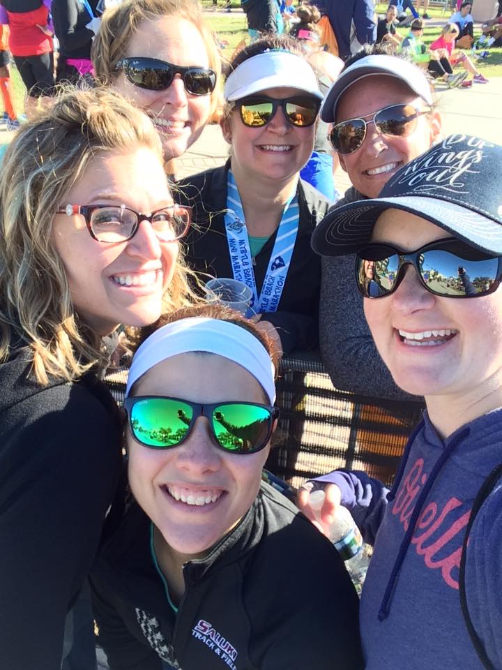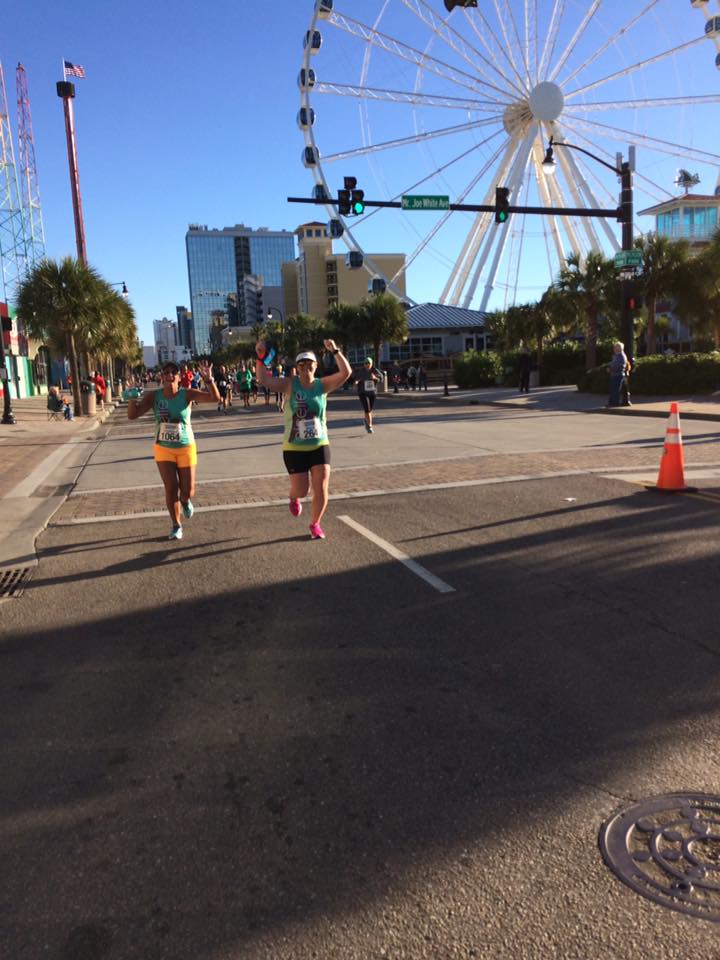 Sunday dawned bright, early and cold. We geared up, took care of business and headed out to the race start. We were able to sit in the car until almost race start which was nice to stay warm. A couple visits to the porta-potties and ingesting my pre-race food and I was ready to roll! The weather ended up being absolutely perfect. I run so much better when I’m not dying from humidity. Anyway Brooklyn and I started out a little quick but then settled into a nice comfortable pace. We were able to chat the entire time, talk to others on the race, hi-five the crowd, and thank the race support. We got to see our cheer team twice! More hi-fives and hugs to go around and then it was off on our way. We made one big turn and then ran along the beach with beautiful views. Again perfect temps and we were cruising. We both experience a little tightness from our injuries around mile 11 but with only a little bit more to go kept on pushing. I looked down at my watch around this point and realized we were really close to my PR. So we took off a little, especially on the last bit on the windy boardwalk. Finally we finished- 31 seconds off my PR. Amazing. For a race I didn’t stress about, just enjoyed and hung with a friend and I did better than I had all year. Definitely something to this running for fun!