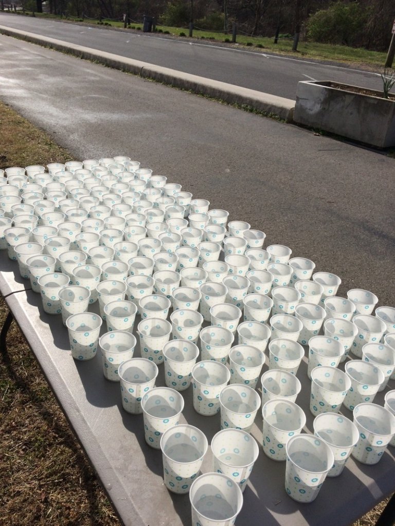 When I arrived the main setup was already done by the Fleet Feet coordinator so I was on water cup duty. Fill 1/2 way for easy drinking and repeat! There was also a kiddie pool filled with water for all the dogs to drink from. And I got a snazzy neon yellow volunteer shirt for the day!