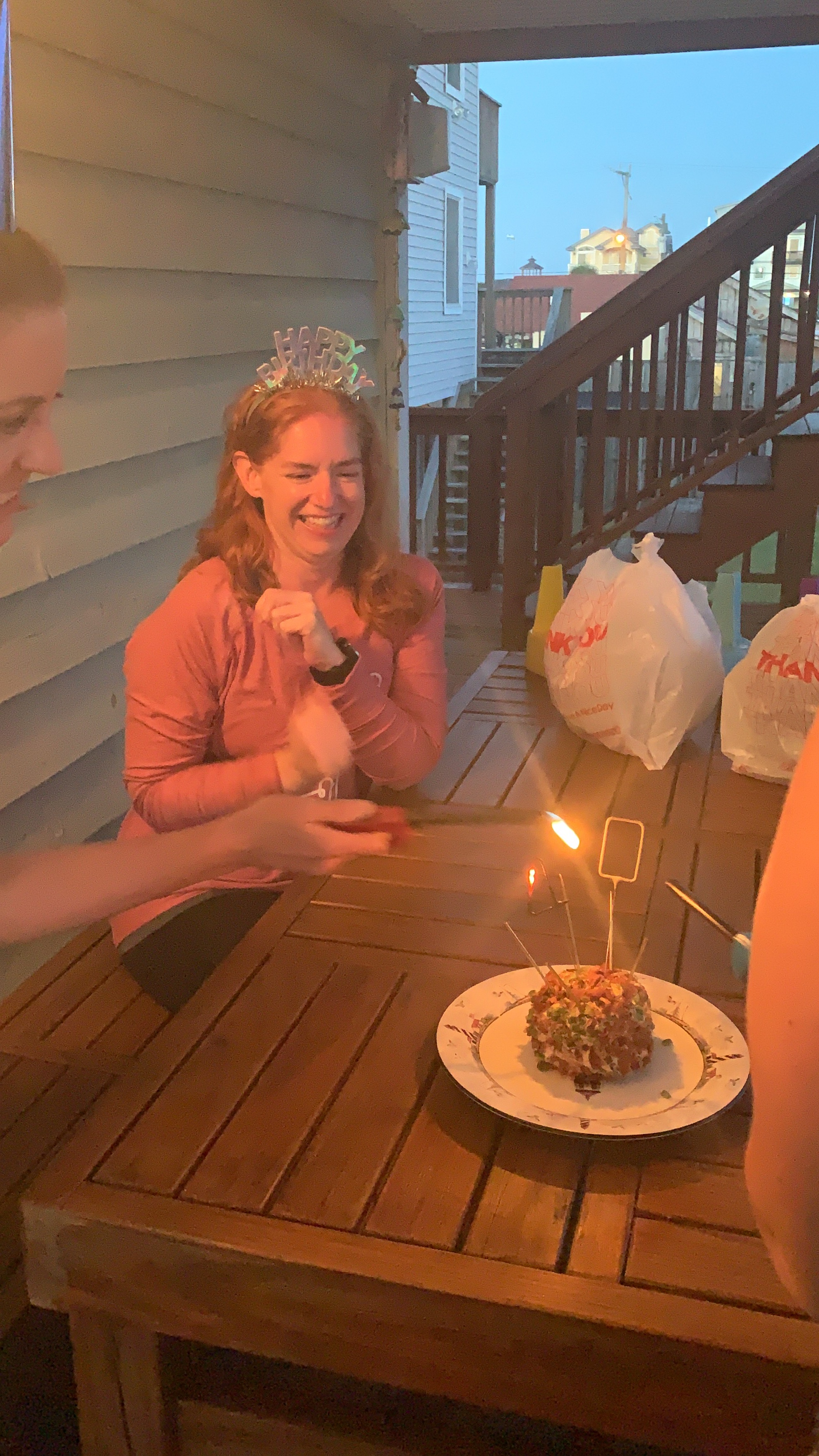 Then it was all the food, and time for the BEACH! We loaded up and walked over to pick out a spot. Thankfully I’d borrowed my in-laws tent so all us pale folks wouldn’t get burned 😀 A nice day of lounging under the tent, playing in the water, drinking all the Trulys, listening to all the music, and catching up with some of my favorite people. We finally headed back to the house to clean up, relax more and get takeout seafood from the Bonzer Shack next door. Campbell arrived just in time for dinner and to help us decorate real quick for a tiny celebration for Wynsor’s 40th birthday. We wouldn’t be seeing her on the real day so any excuse to celebrate!!